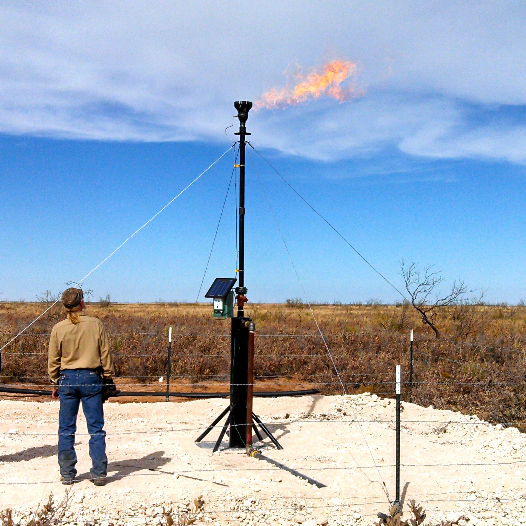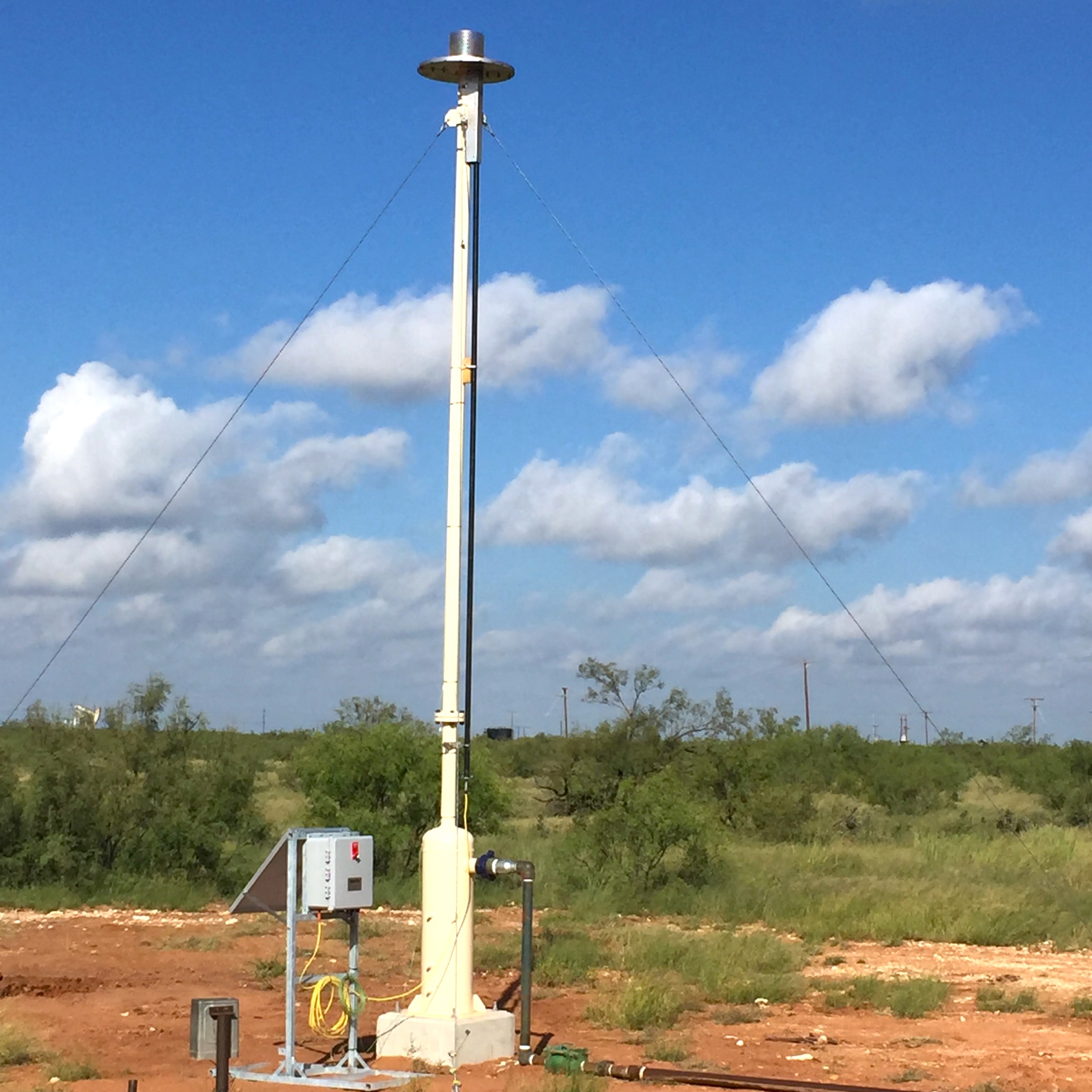 The Low Flow Flare utilizes a battery/solar-powered direct spark ignition system. The direct spark ignition system produces a spark at the flare tip every three seconds regardless of if there is waste gas flow going to the flare or not. The continuous direct spark ignition source also includes a continuous ignition monitoring device that gives notification each time the ignition probe sparks to give the site personnel assurance an ignition source is present at all times.